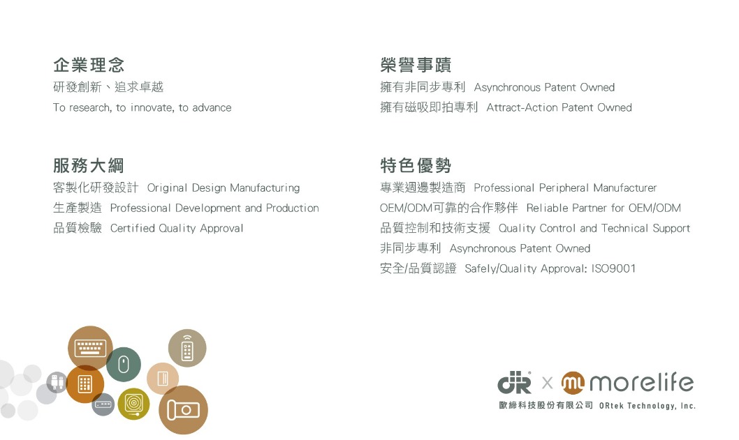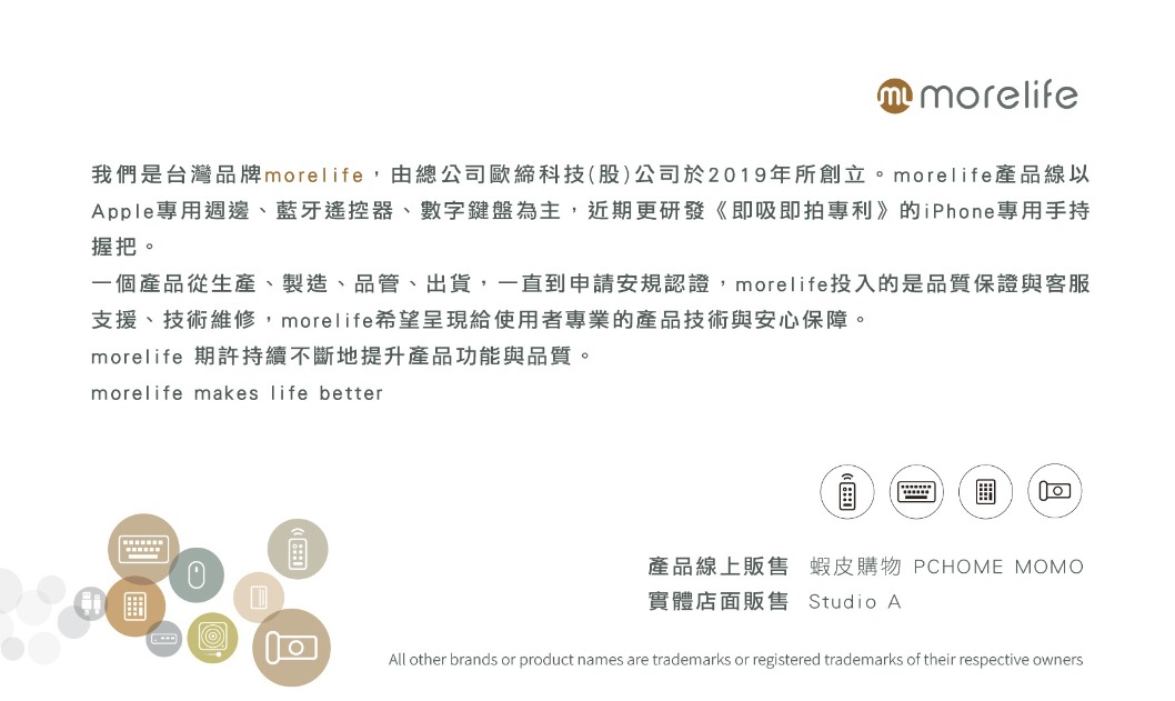 台灣品牌morelife,由總公司歐締科技(股)公司所創立。歐締科技(股)公司成立於1989年,其生產製造之產品皆經國際認證與台灣安規認證:CE、FCC、BSMI、NCC。
