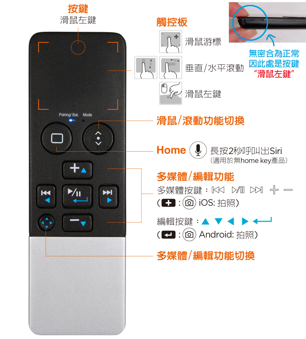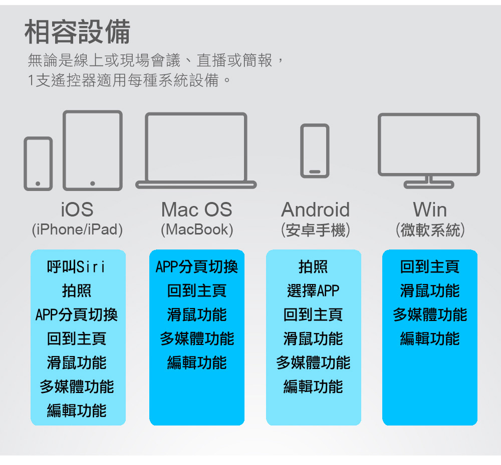 設備相容:iOS/Android OS/Mac OS/Win OS(快捷鍵支援可能會隨系統(OS)更新產生支援變更。)