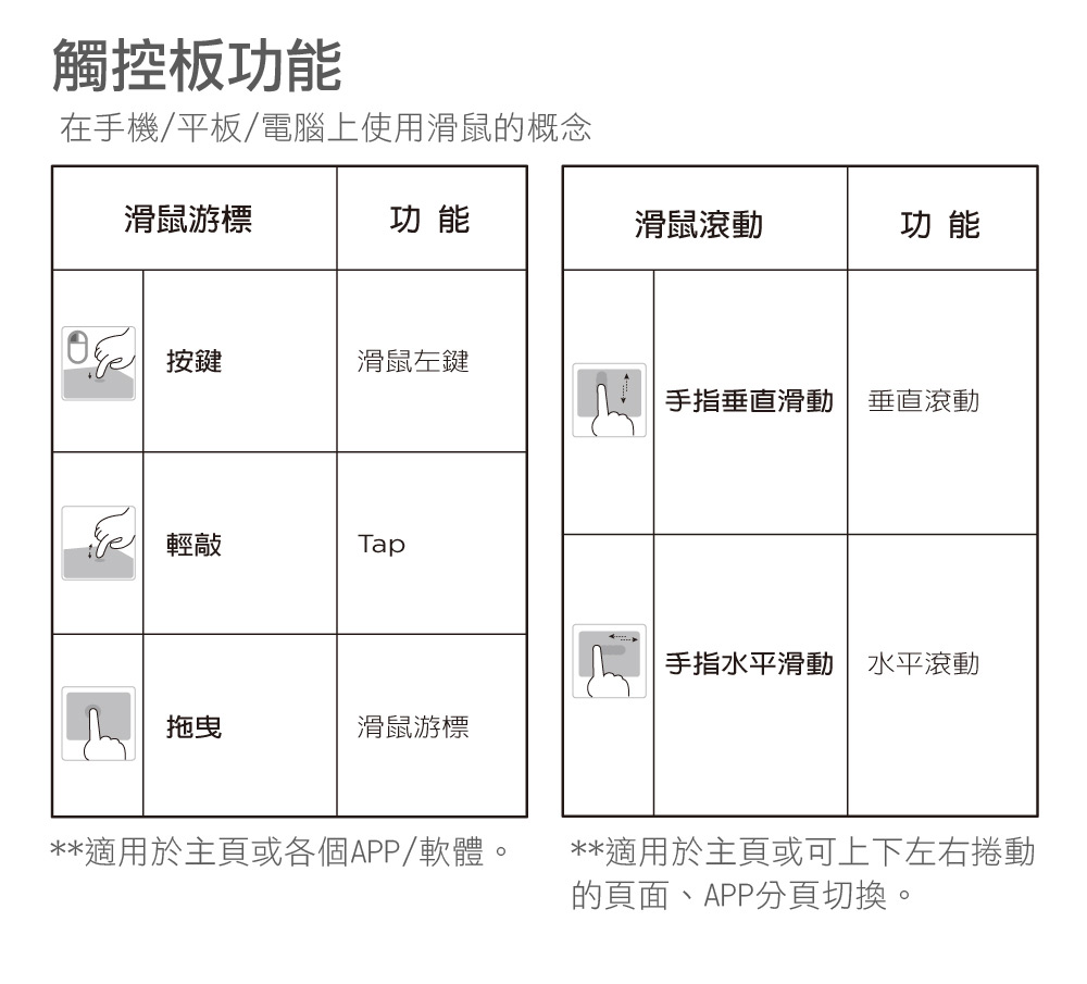 ◆ 觸控板功能:滑鼠游標/滑鼠滾動切換