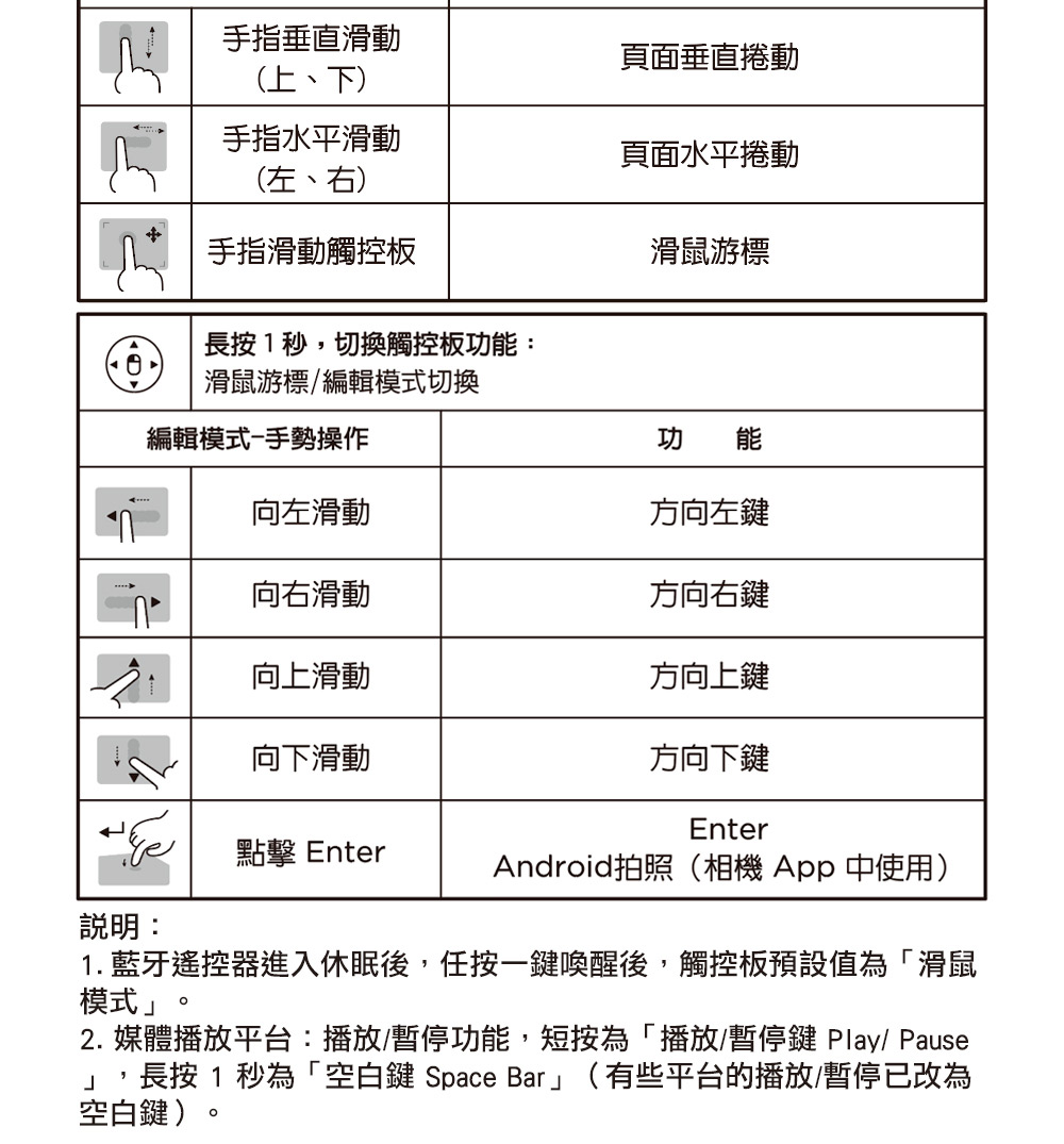 BRC-500是一支可以同時操控兩台裝置系統的藍牙遙控器。它的觸控板是單指功能觸控板,主要操控滑鼠游標或方向滑動,編輯模式下, 觸控板為上/下/左/右/輸入功能。此遙控器也支援滑鼠左右鍵功能,無論是滑鼠游標移動、方向滑動或是左右鍵,BRC-500都能支援。