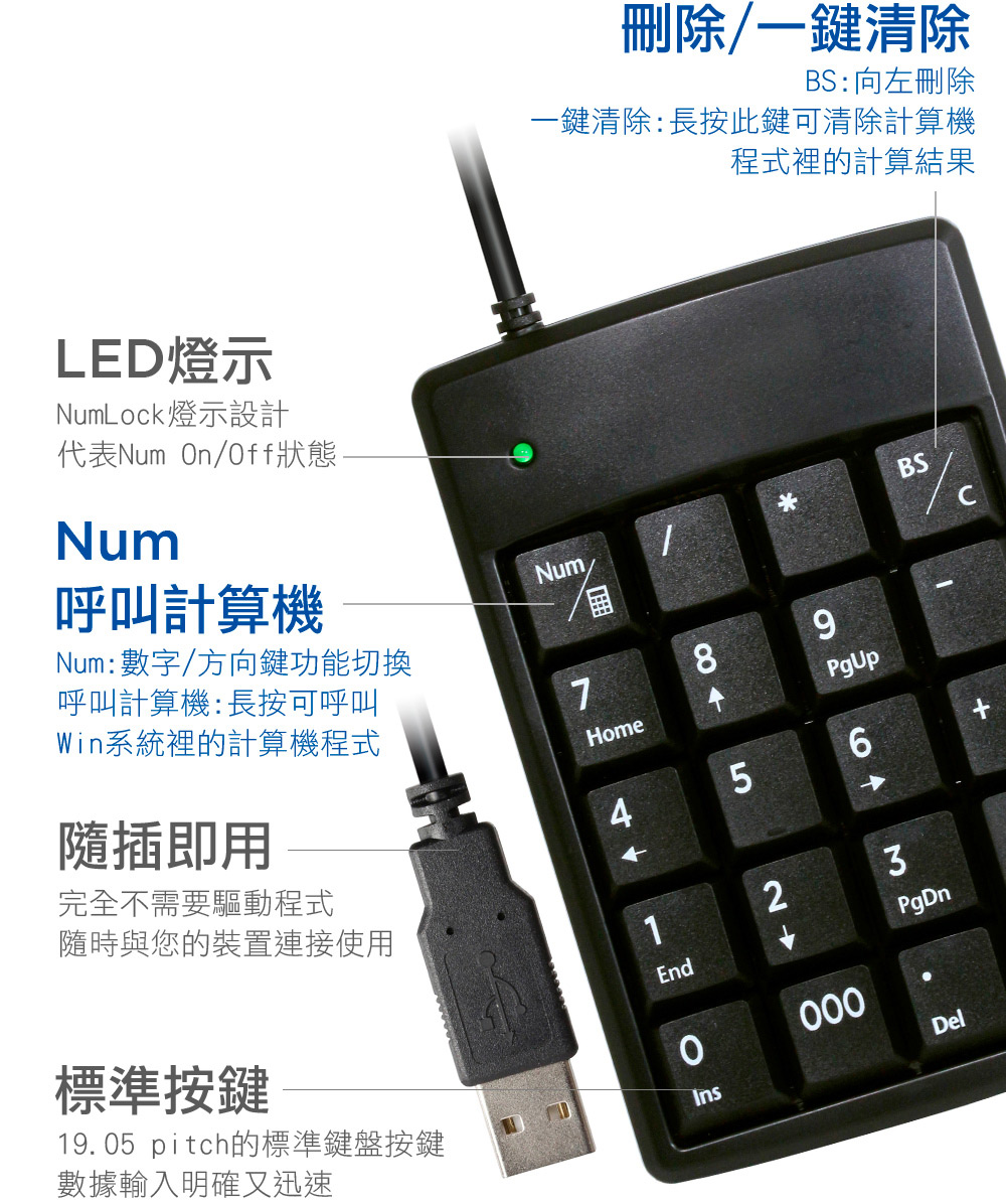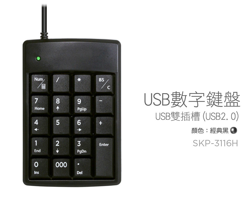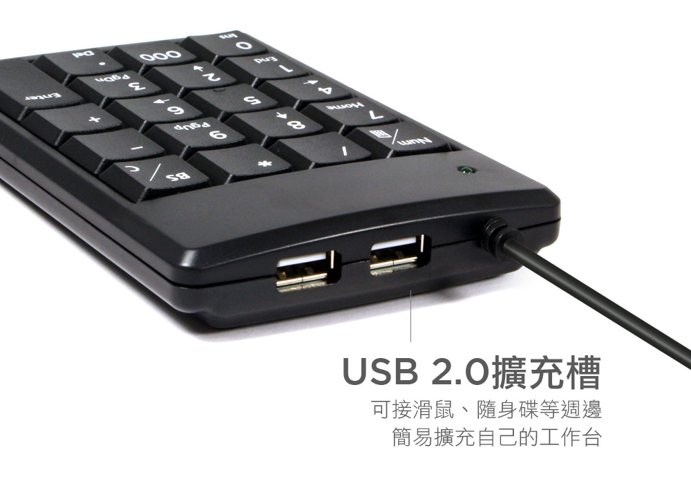 暢銷品WKP-3180NK的有線款/呼叫計算機程式/一鍵清除計算機結果/擁有非同步專利權/隨插即用超方便/支援熱插拔功能/2孔USB2.0擴充槽/LED燈顯示NumLock狀態