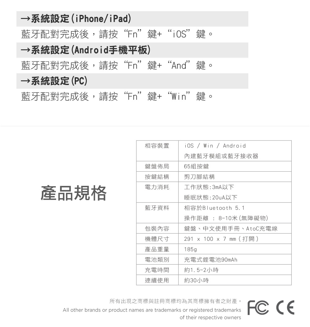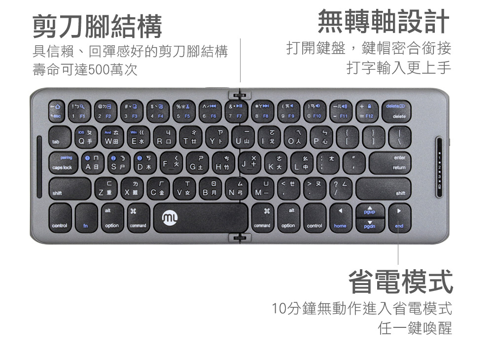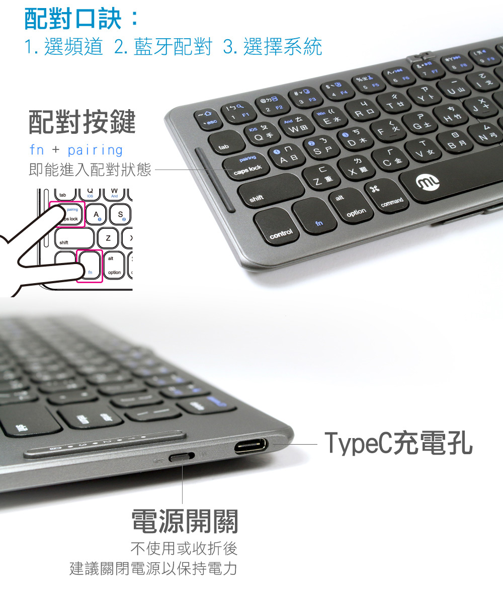 無縫折疊設計盲打易上手|注音/倉頡 中文鍵盤介面|支援TypeC充電埠|最多同時連接三台藍牙產品|支援三大系統iOS、Win、Android|剪刀腳結構|17mm按鍵尺寸|藍牙無線連結最長10米|一鍵喚醒功能超省電|配對/低電量/充電LED指示