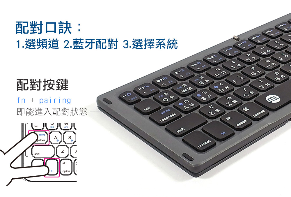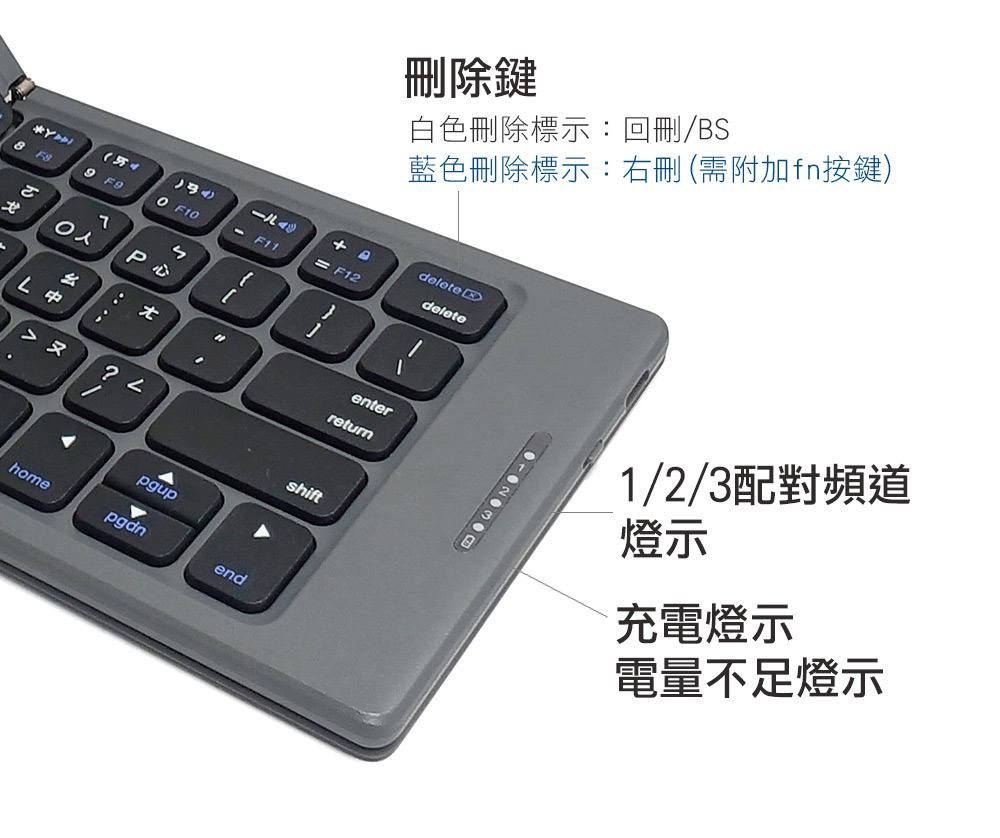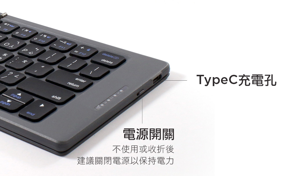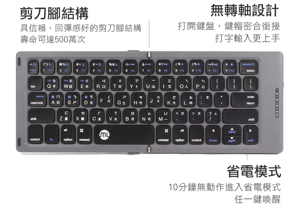 無縫折疊|盲打易上手|經典太空灰皮革設計|同時連接三台藍牙產品|支援三大系統iOS、Win、Android|注音/倉頡 中文鍵盤介面|支援TypeC充電埠|剪刀腳結構|17mm按鍵尺寸|藍牙無線連結最長10米|一鍵喚醒功能超省電|配對/低電量/充電LED指示